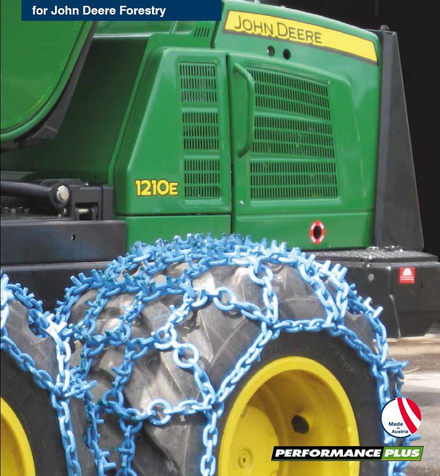 Corrente de tração para pneus de equipamentos florestais homologados pela John Deere.